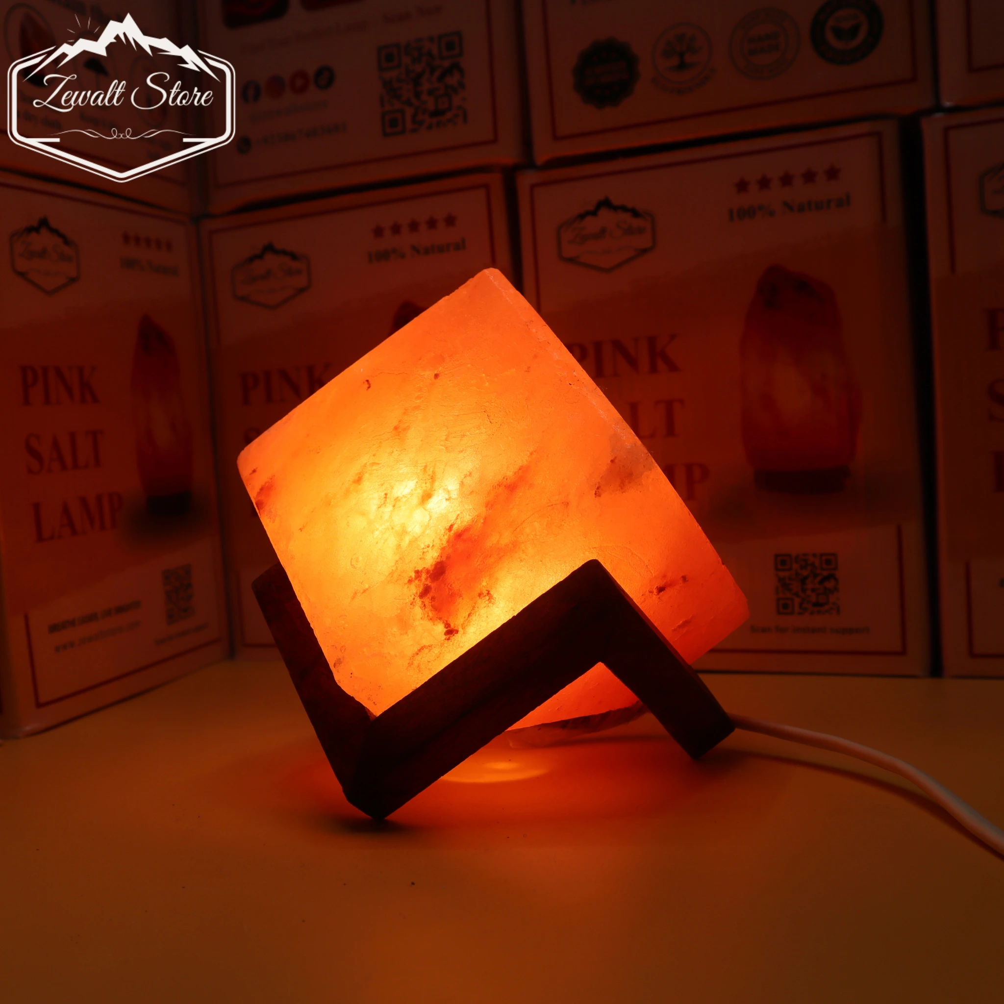 Cube Shaped Himalayan Pink Salt Lamp 1.5 KG with Wooden Stand – 220V Decorative Lamp