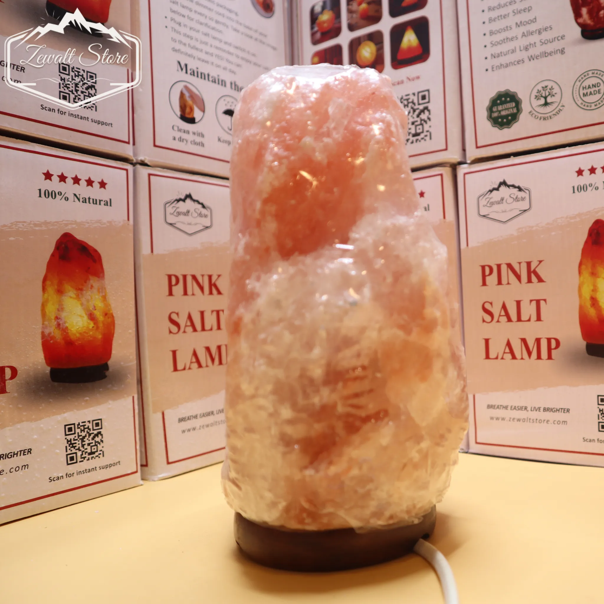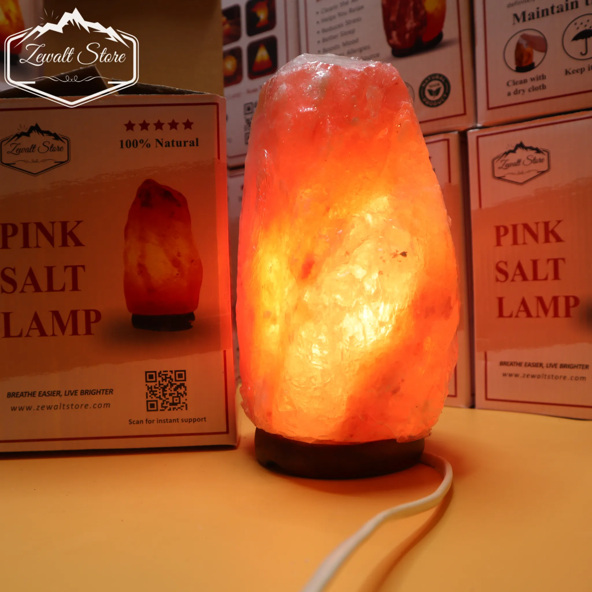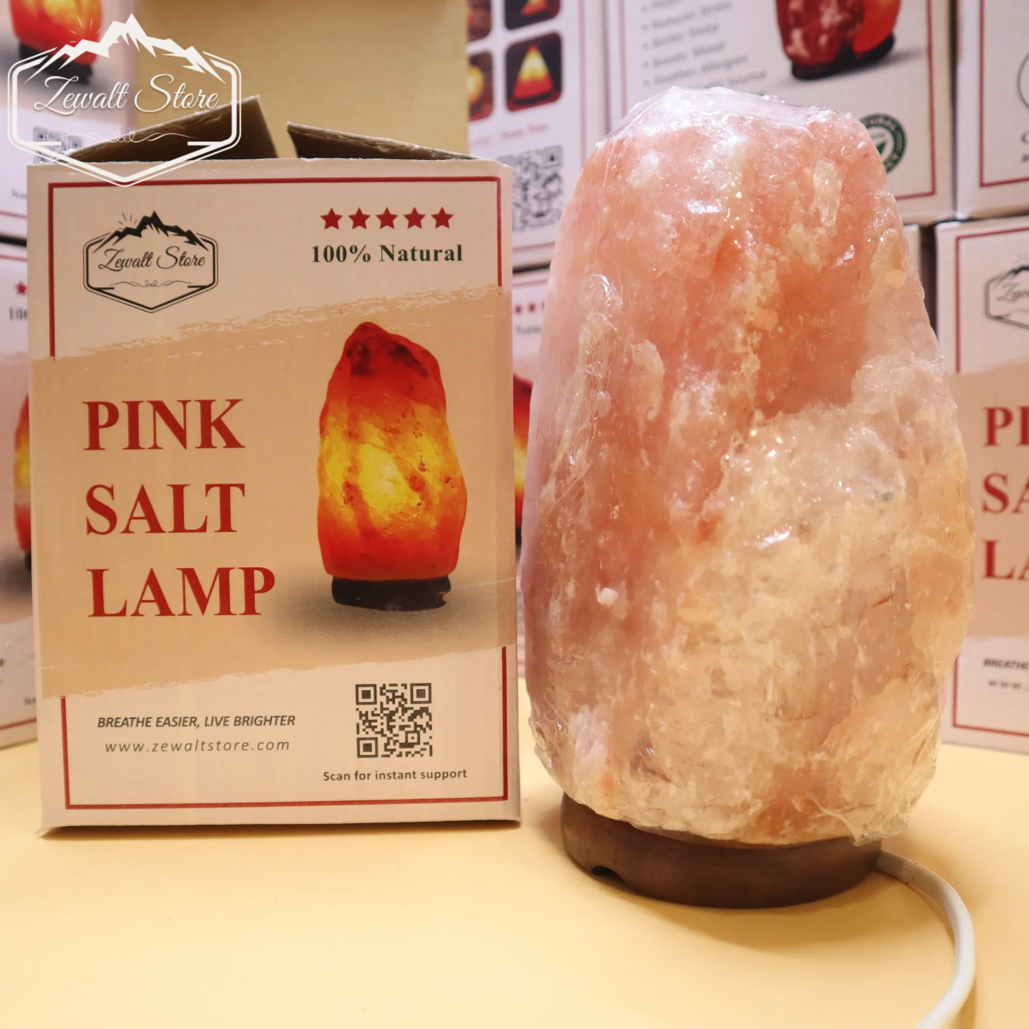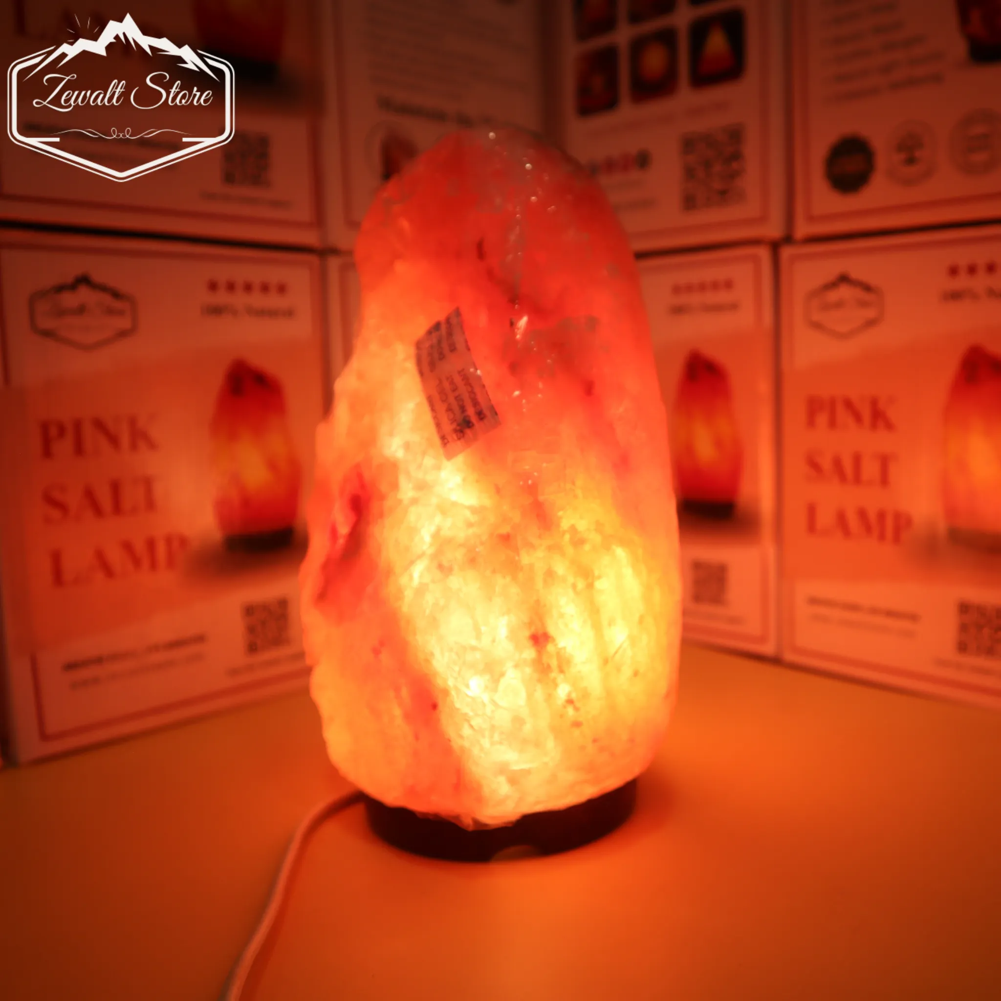Authentic natural shaped Himalayan pink salt lamp. 220V filament bulb with wooden base, perfect for home, office, spa, and wellness décor.